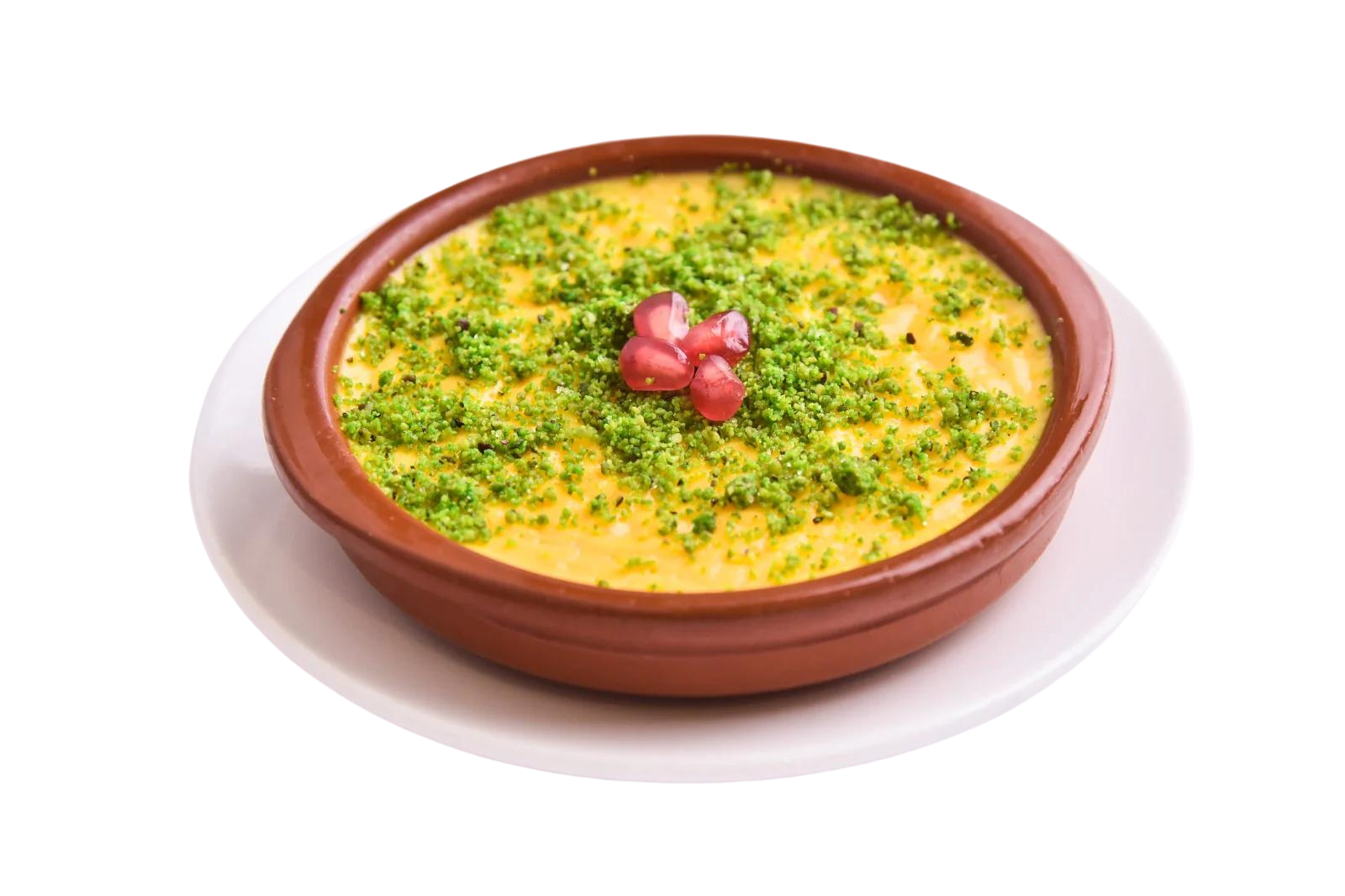 Traditional Egyptian Dessert Made with Fresh Milk and Cream finished with Assorted Nuts Baked in the oven to your perfection. Pistachio Ice Cream Additional to your liking