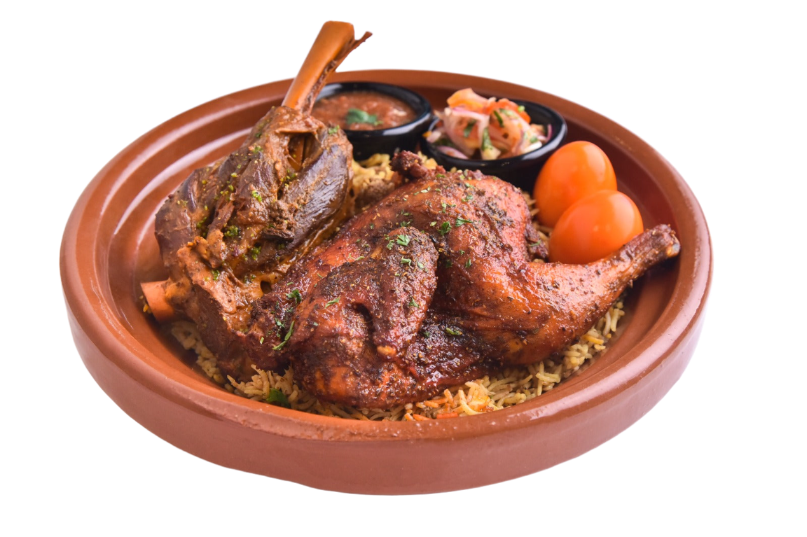 Half Roasted Chicken marinated over night with a special blend of spices served with Makloubah Rice, Saffron boiled Egg, Arabic salsa and Penang achar salad